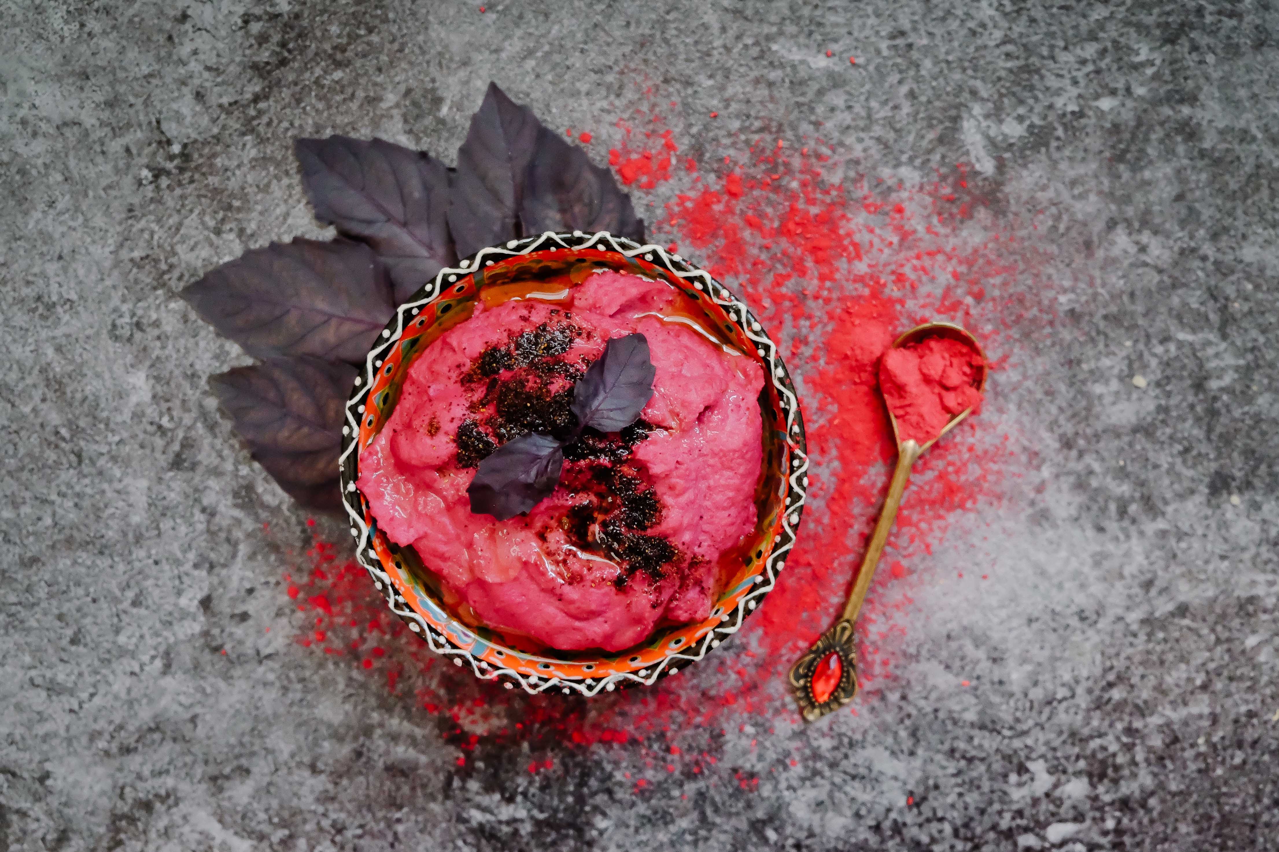 I created a hummus duo spicy and sweet that can be enjoyed alone or together using the following Feinstoff products: raspberry powder, help protein, hemp seeds, cabbage powder – in order to showcase how versatile the products are and how to combine them best.