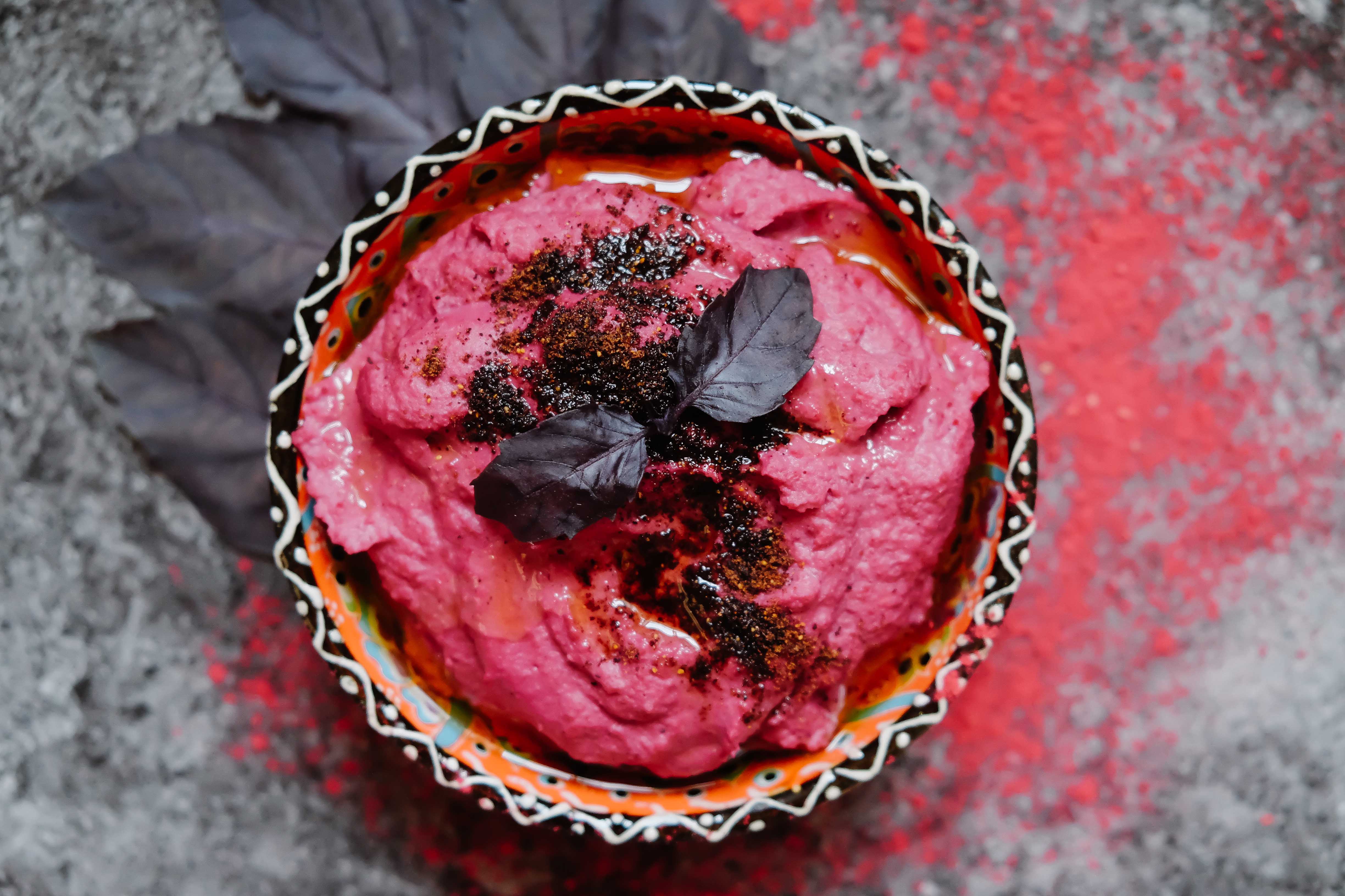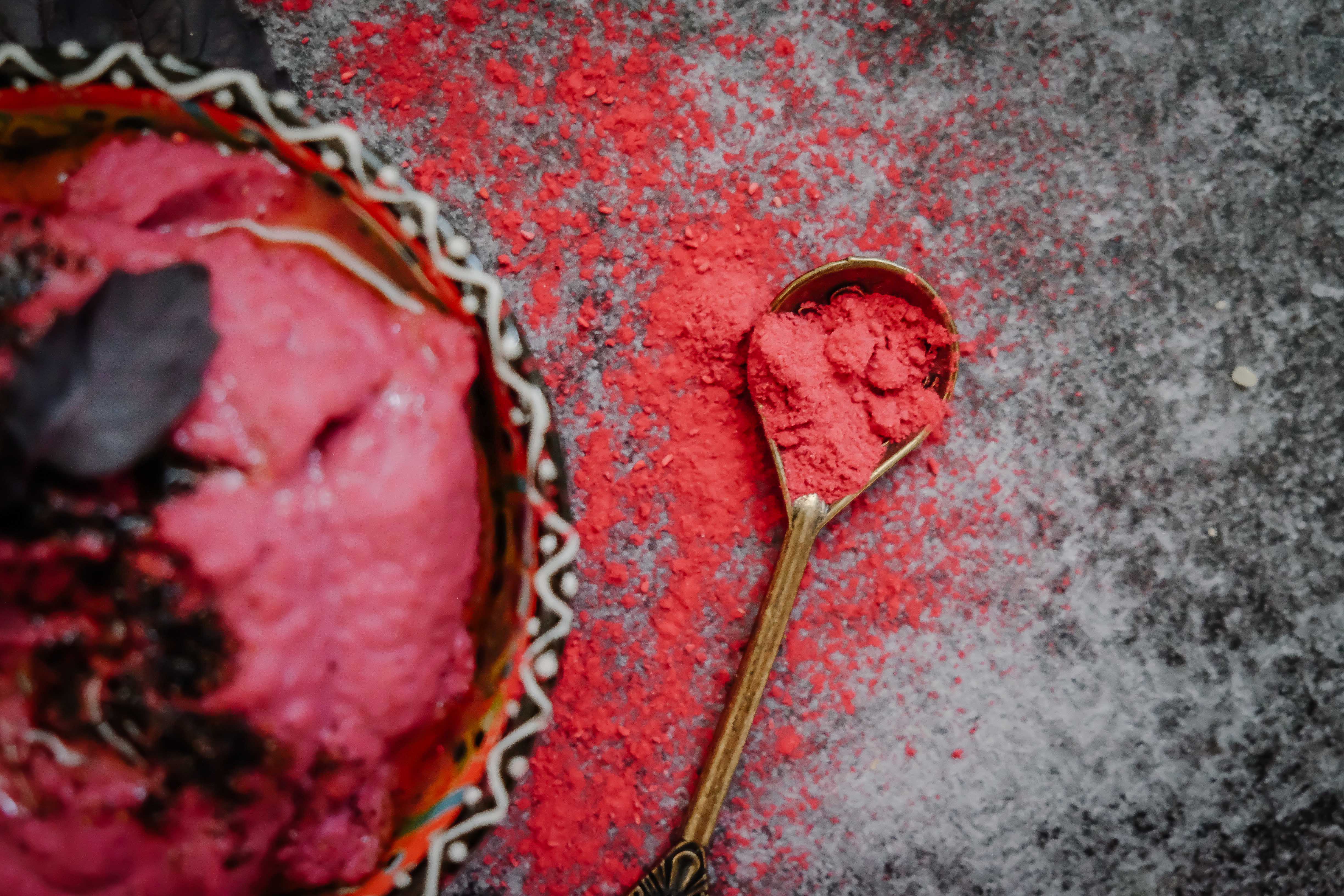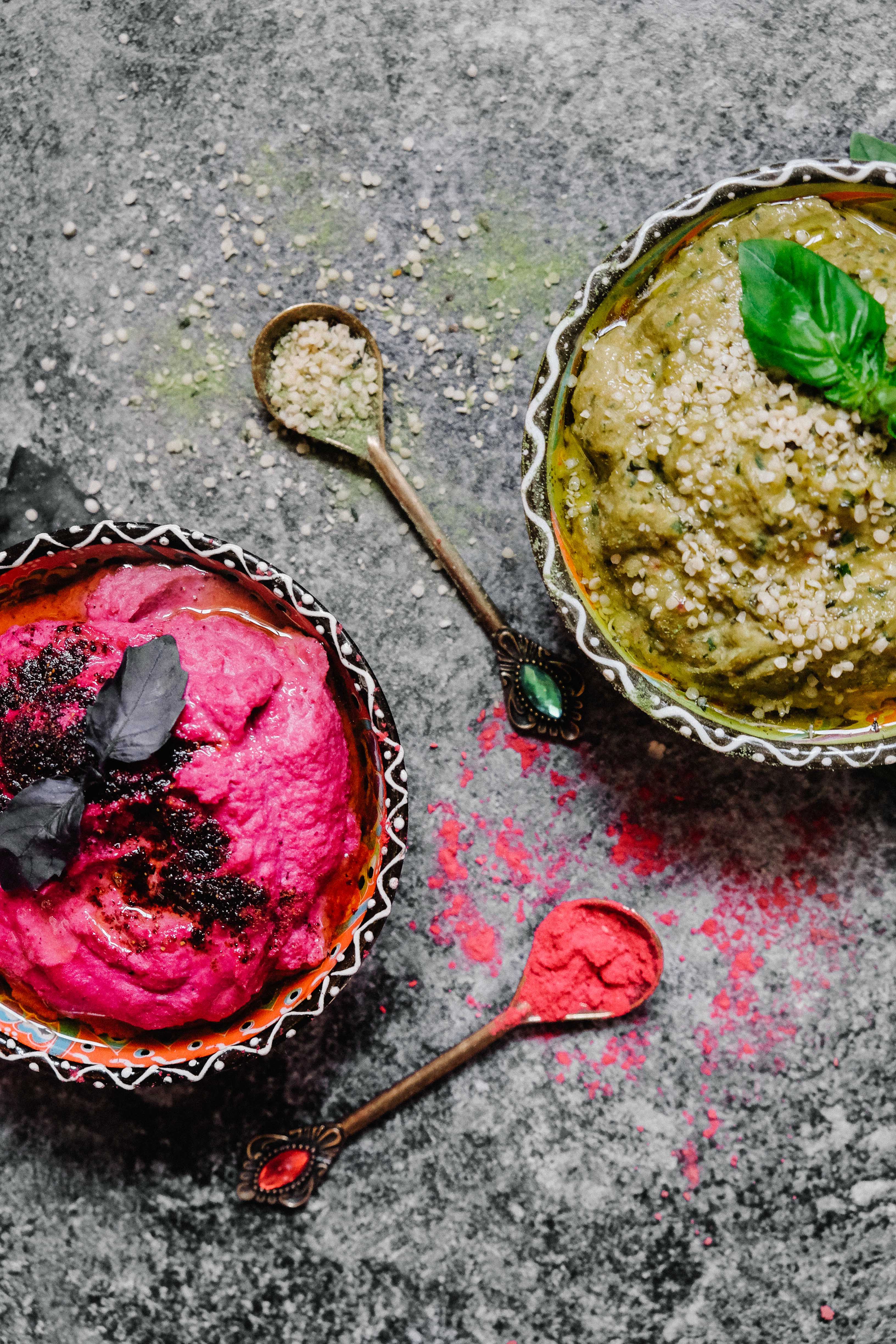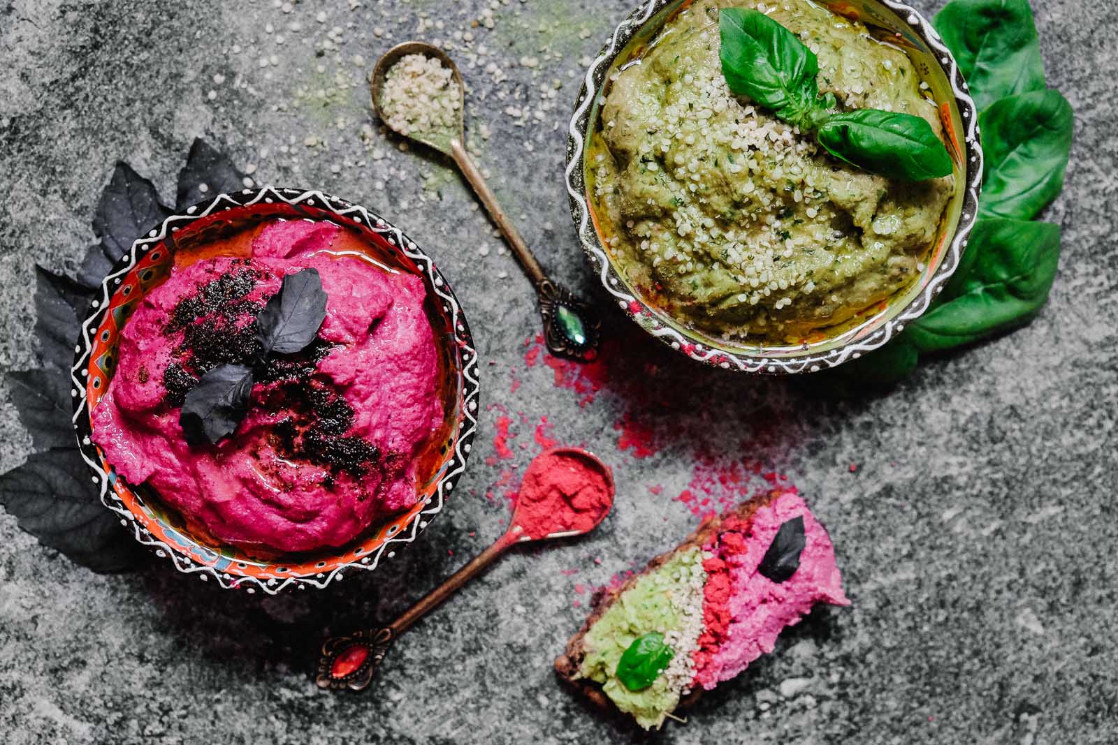 I created a hummus duo spicy and sweet that can be enjoyed alone or together using the following Feinstoff products: raspberry powder, help protein, hemp seeds, cabbage powder – in order to showcase how versatile the products are and how to combine them best.